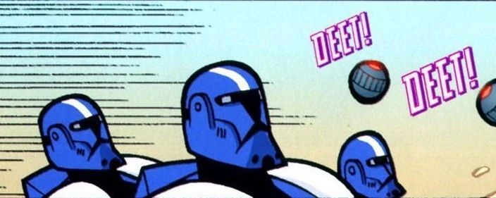 In 2005, Star Wars Clone Wars Adventures Volume 3 was published with "The Package" introducing two commando squads. Though unnamed within the comic itself, for reference, Blue Squad and White Squad are conjectural and used simply for reference.[7]